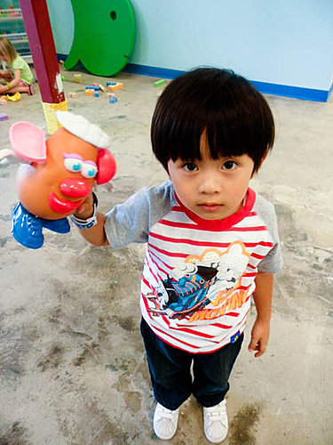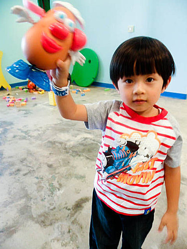 除了游泳池﹐還有一個角落有些玩具供孩子玩﹐口水禧最近猛看Toy Story﹐所以對這個Mr/Mrs Potatoe Head 非常感興趣﹐在學校也是老抱著它在玩。